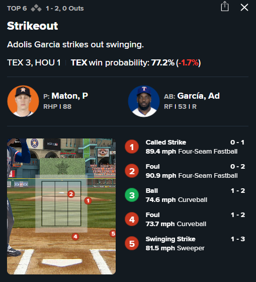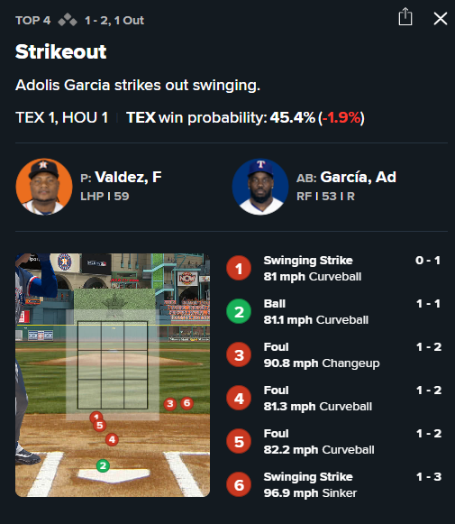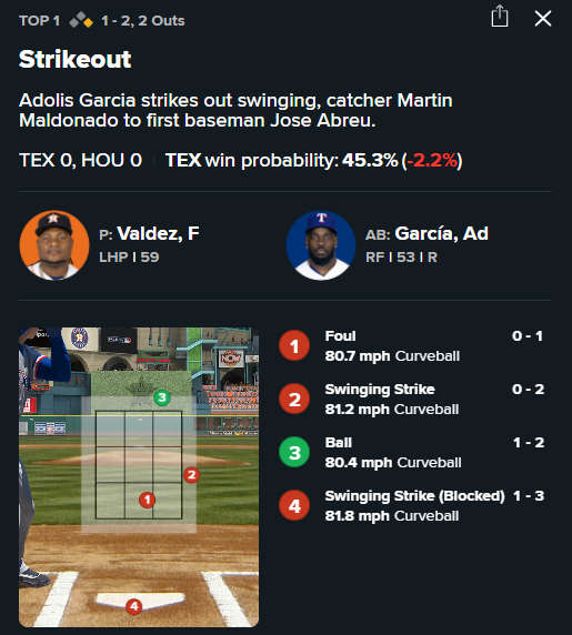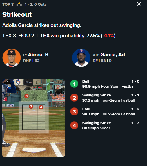 Garcia was 0-4, with 4 strikeouts and quite a few chases on his charts. It's hard to qualify any of these as "good at bats". However, the lesson to be learned here is that despite having an objectively awful day, there was still a chance for him to atone in the biggest moment of the game. In your career, you are going to have an 0-4 day. What separates you from the next guy is how you handle that failure. This can be from a game to game or at-bat to at-bat standpoint.