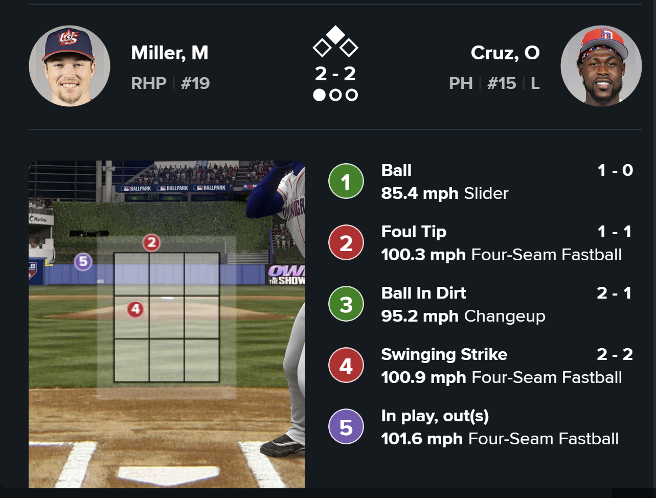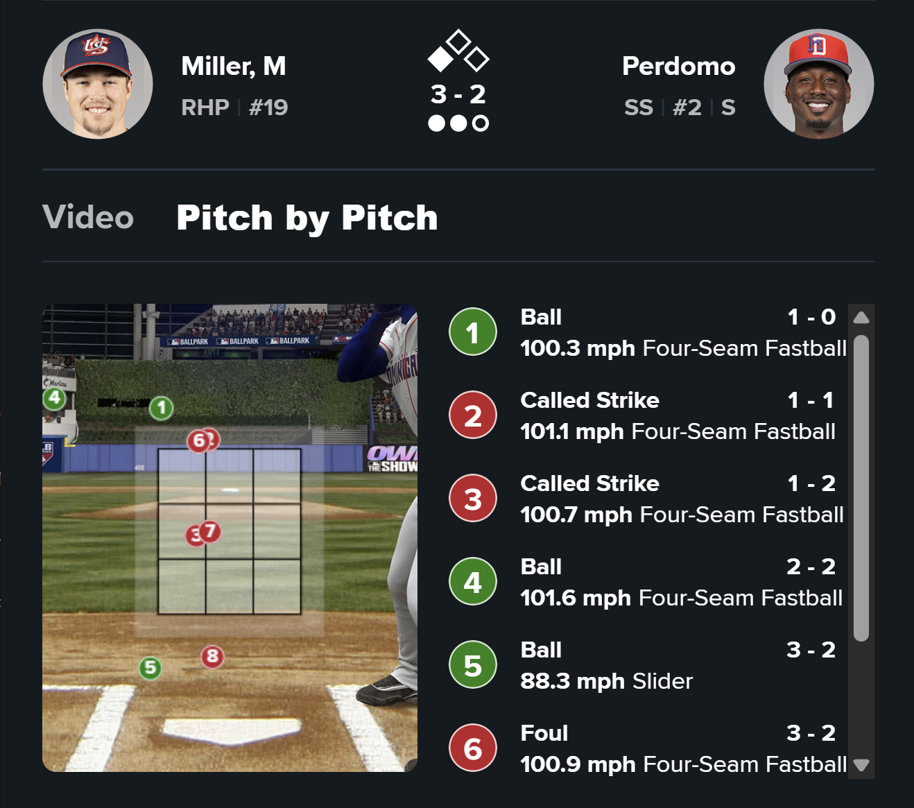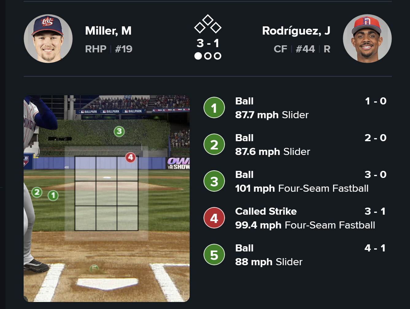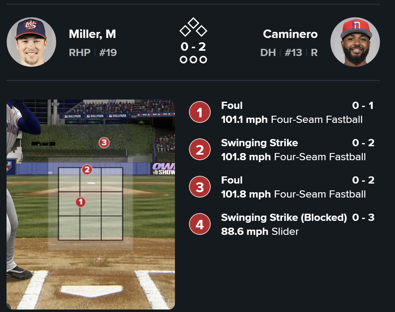 How does a pitcher earn an extended zone? Mostly by consistently being in the strike zone and throwing competitive misses. Not misses that are making the glove move a whole foot. In this case, Mason Miller was ALL OVER THE PLACE. He only got ahead of one hitter (the first hitter he faced), he walked another, he threw a wild pitch and his misses were not competitive or consistent. He actually threw more balls out of the strike zone than in it, but did get some chase swings to get his strike percentage up over 50 percent (which still isn't good). These are the charted pitches for each at bat: