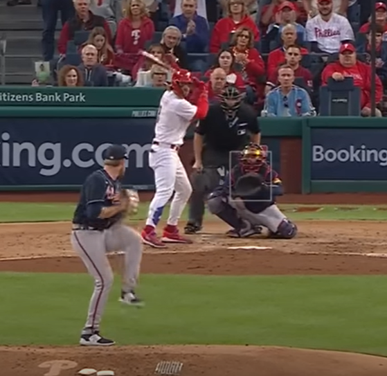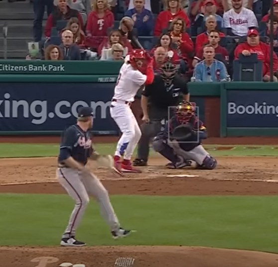 This was one of Bryce Harper's homers last night against Bryce Elder. Fast forward to the 0:30 point of the video. He starts to pick his front heel up right before Elder separates his hands. Notice how deliberate his feet are throughout the load and gather of his swing. Here are screenshots of the exact moment he BEGINS to pick his foot up.